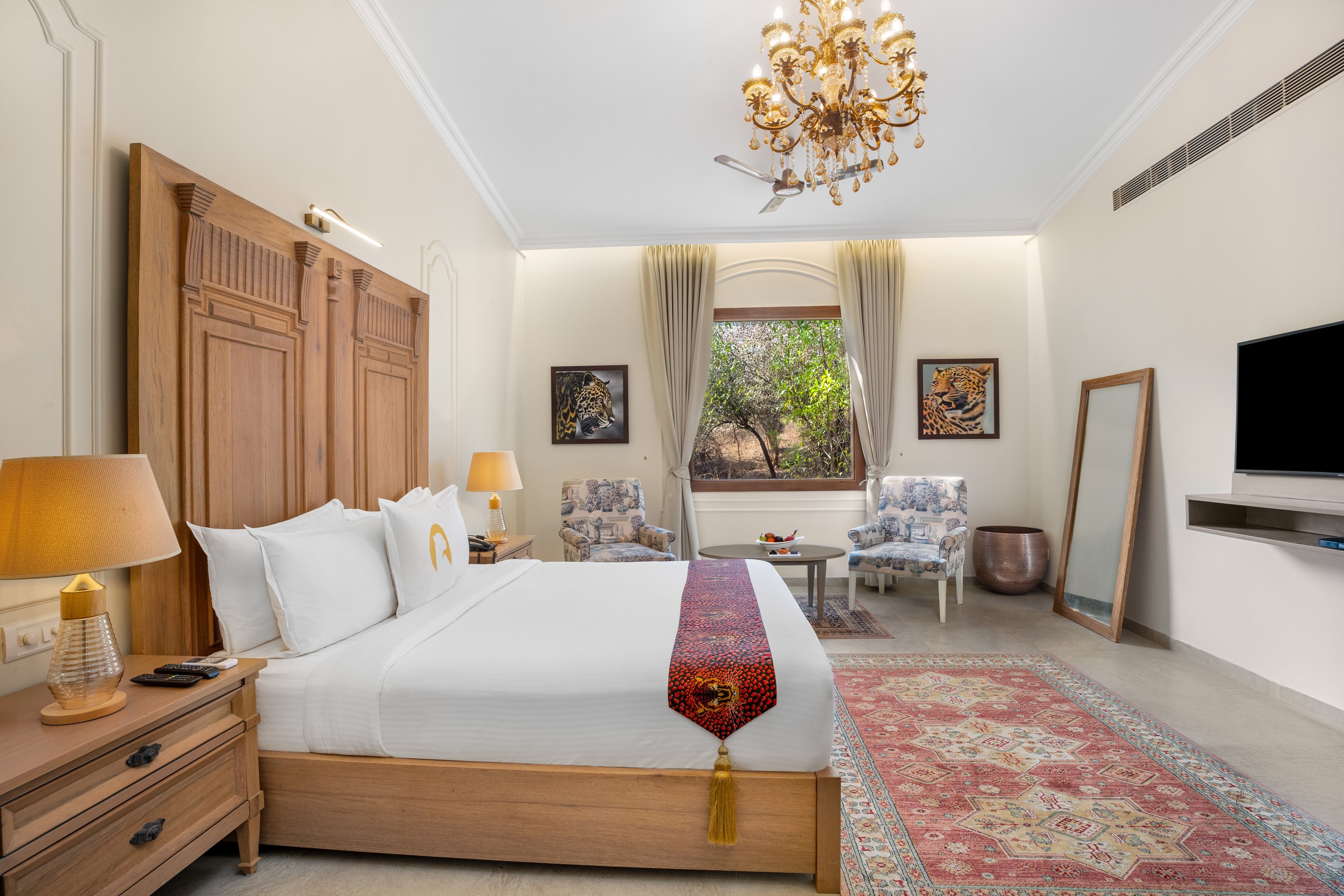 The 550 sq. ft. chalet is equipped with a double bed, an intimate sitting area, and a spacious bathroom with a spectacular view of the garden and the Aravali hills from the porch. The furnishings in the chalet are a blend of authenticity with a modern hint. Whether you’re on a long weekend getaway or on an adventurous leisure trip, there’s something for everyone. The chalet is perfected with the finest amenities for your comfort such as 48” Smart TV and a cubical shower. – King Bed – 550 sq.ft – Inclusive of Breakfast – 2 Adults + 1 Extra bed
